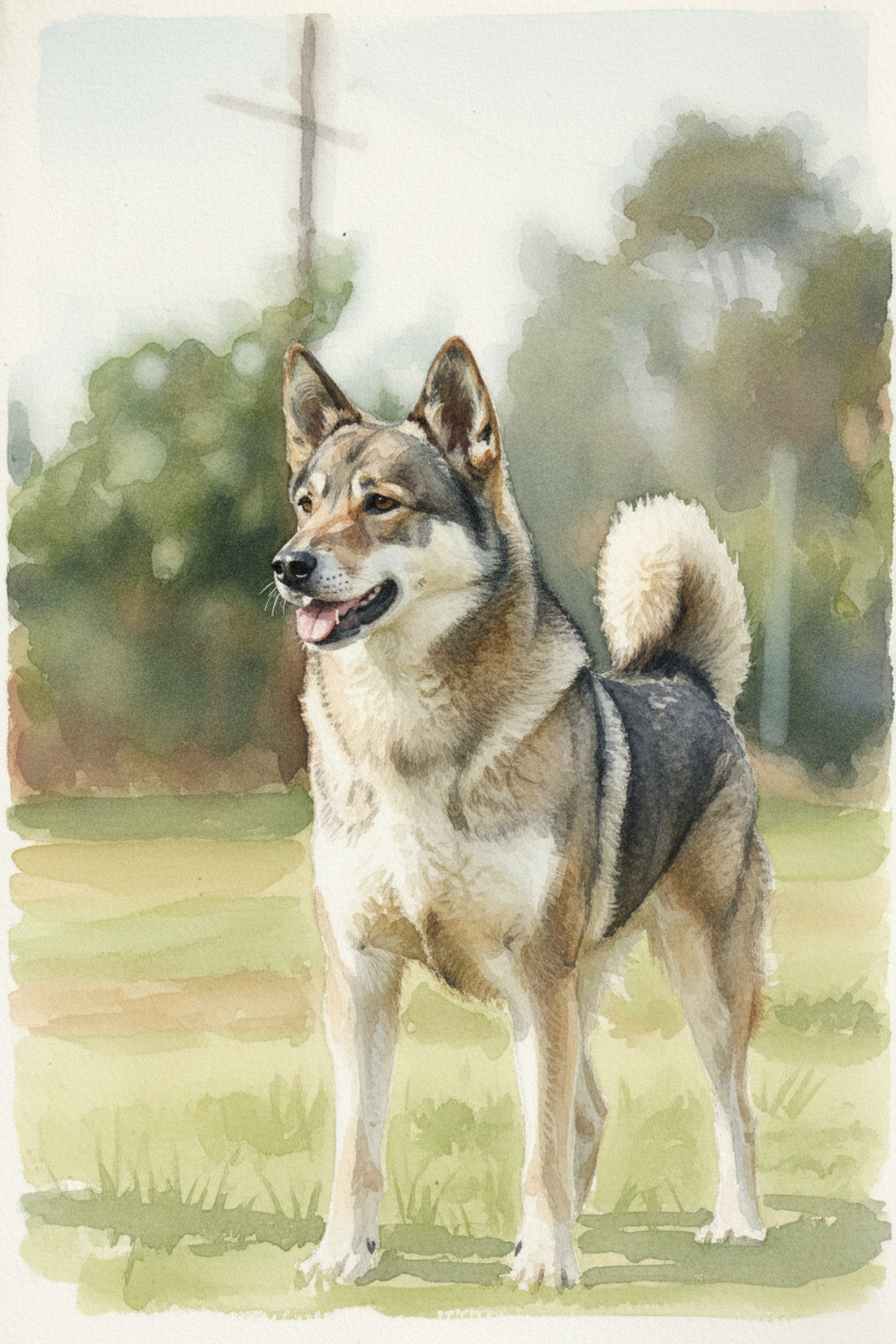 개의 전체적인 모습은 건강하고 자신감 넘쳐 보이고 꼬리는 위로 말려 있고 귀는 쫑긋 세워져 있어서 주변 환경에 완전히 집중하고 있는 모습 입니다.