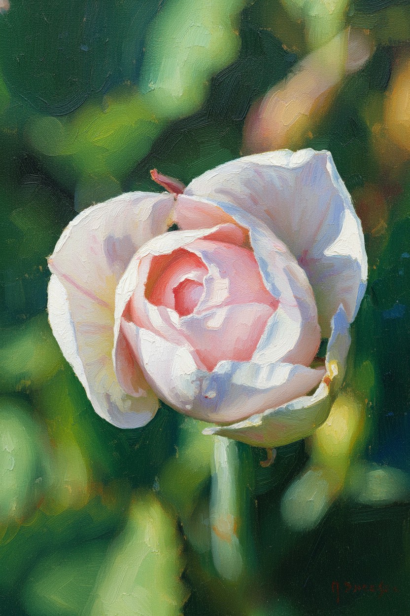 짙은 녹색 잎이 무성한 배경에 반쯤 핀 분홍색과 흰색 장미 한 송이를 유화로 표현한 작품입니다.