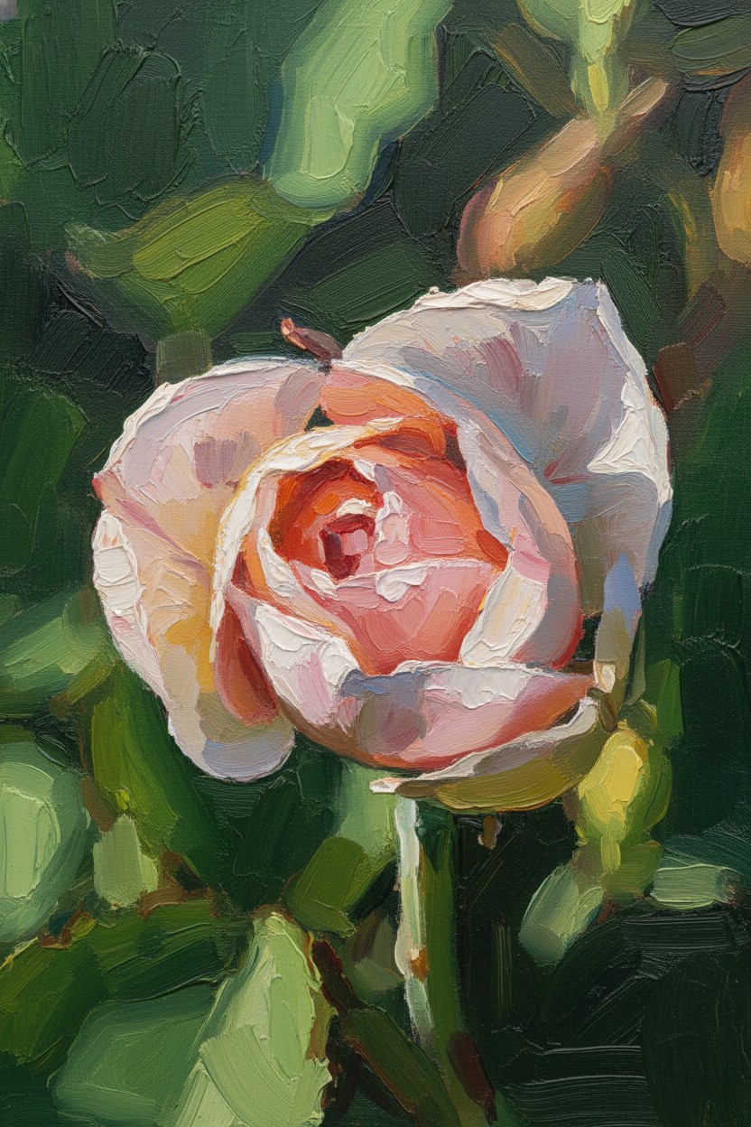 왼쪽 상단에서 장미에 빛이 비추는 것처럼 보이며, 일부 꽃잎의 가장자리는 밝은 흰색으로 강조되고 꽃의 주름 안에 부드러운 그림자. 꽃송이 아래에는 작고 밝은 녹색 꽃봉오리와 줄기가 살짝 보입니다. 배경은 다양한 색조의 녹색 잎으로 구성되어 있으며, 두껍고 표현력 있는 붓 터치로 표현했다.