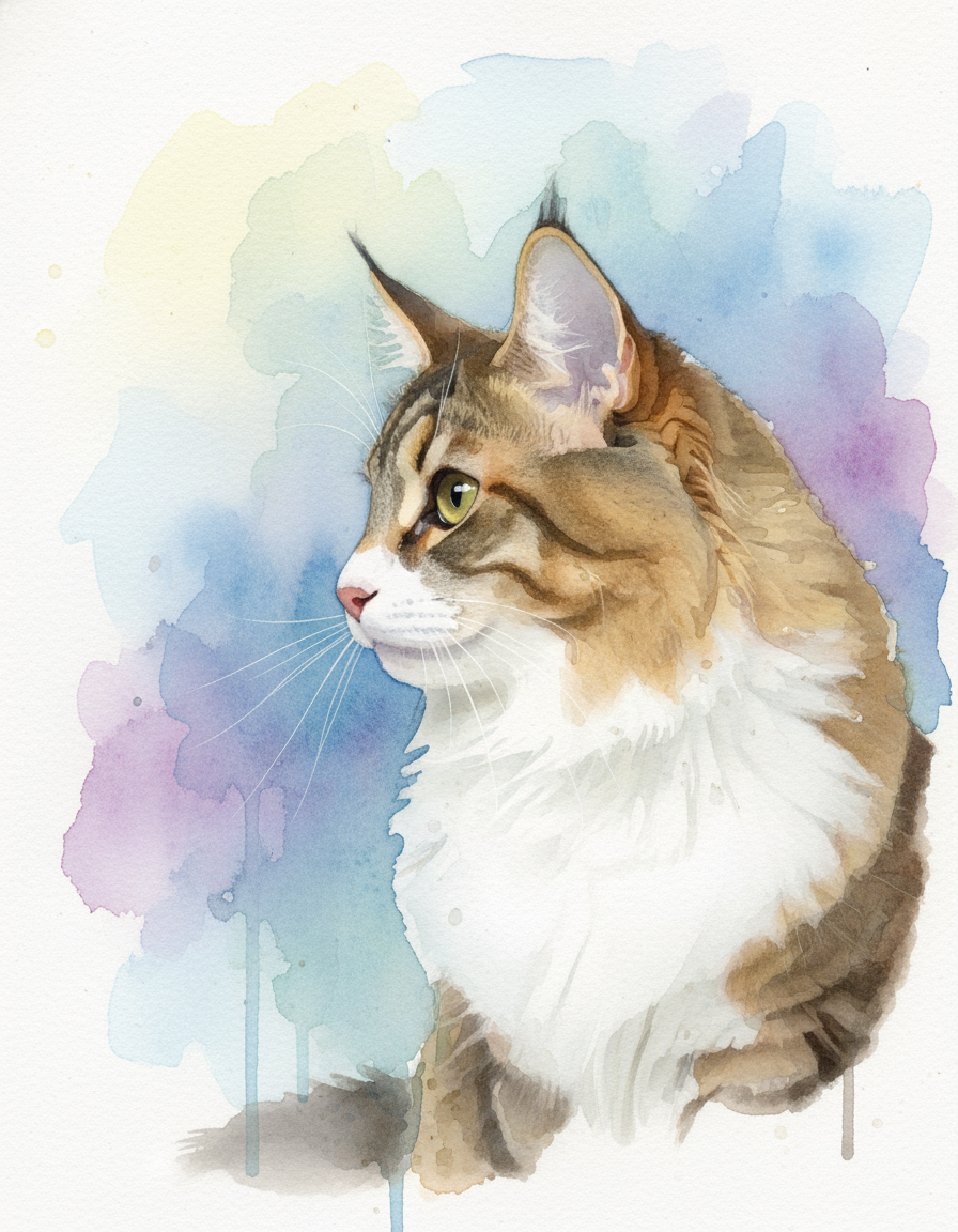 갈색과 흰색이 조화롭게 섞인 털은 고양이의 부드러운 인상을 더욱 강조하며, 배경의 파스텔톤 색감은 몽환적이면서도 따뜻한 분위기를 자아낸다.