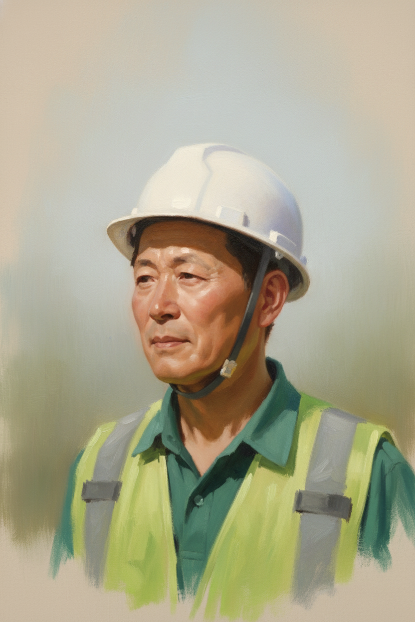 그림의 중앙에는 백인 남자가 흰색 안전모를 쓰고 녹색 폴로 셔츠 위에 노란색 안전 조끼를 입은 모습. 얼굴은 햇볕에 약간 그을린 듯 건강한 피부색을 띠고 있으며, 눈가에는 세월의 흔적이 엿보입니다.
