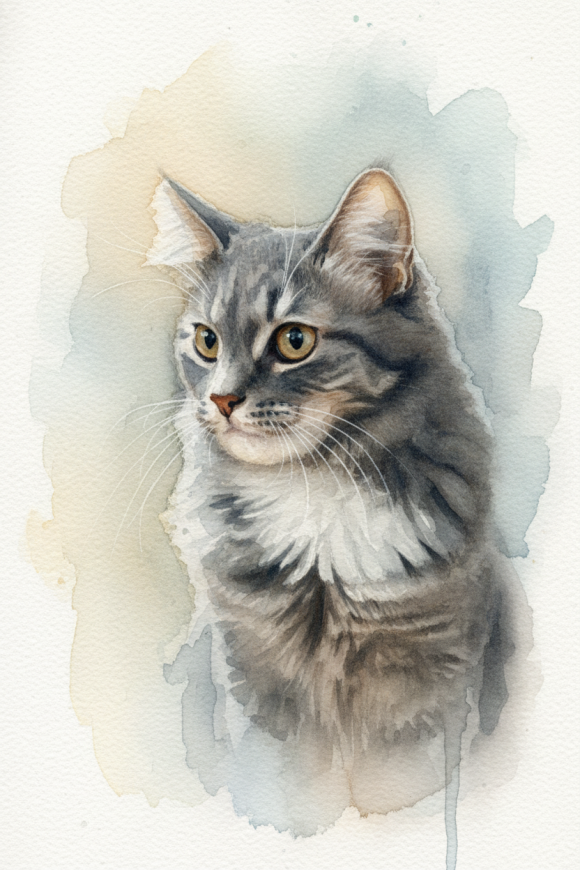 • 수채화 기법으로 고양이의 우아함과 섬세한 감성을 담아냈습니다.