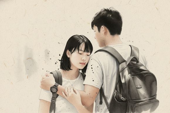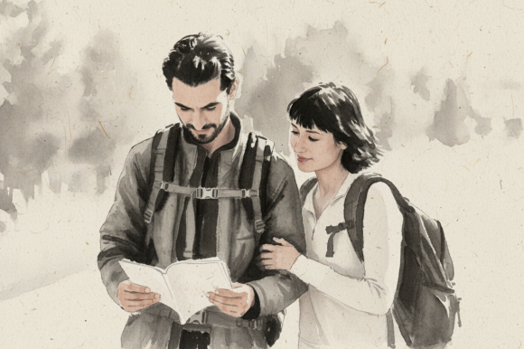 • 여행안내 책을 보면서 등산을 준비하는 듯한 흑백 수묵화