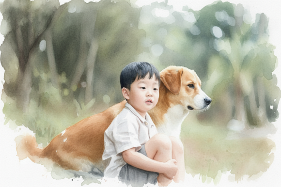 • 맑은 날, 어린 소년이 충실한 강아지 친구에게 기대어 사랑스러운 모습