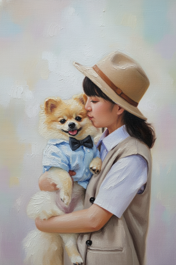 • 모자를 쓴 소녀가 셔츠와 나비 넥타이를 입은 포메라니안