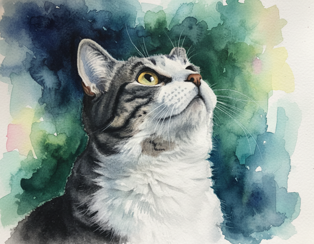 배경은 다양한 색상의 수채 물감으로 표현되어 고양이의 윤곽을 부드럽게 감싸는 듯한 인상을 줍니다. 고양이의 머리 위, 즉 시선의 방향으로 공간을 열어두어 시원한 느낌을 강조하고, 물감이 퍼져나가는 표현을 통해 자유로운 분위기를 연출.