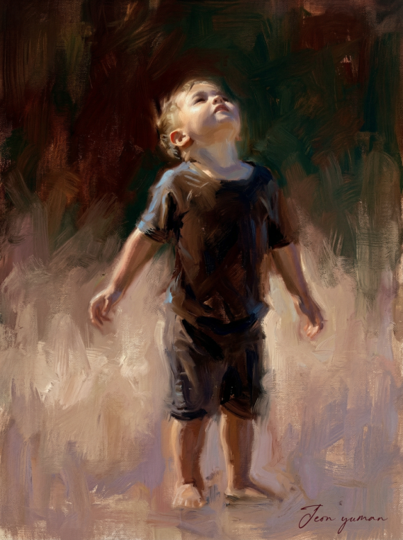흑백으로 표현되어 차분하고 고요한 분위기를 더합니다. 그림의 전체적인 스타일은 사실적이면서도 낭만적인 분위기를 자아내며, 인물들의 감정과 풍경의 조화롭게 표현했다.